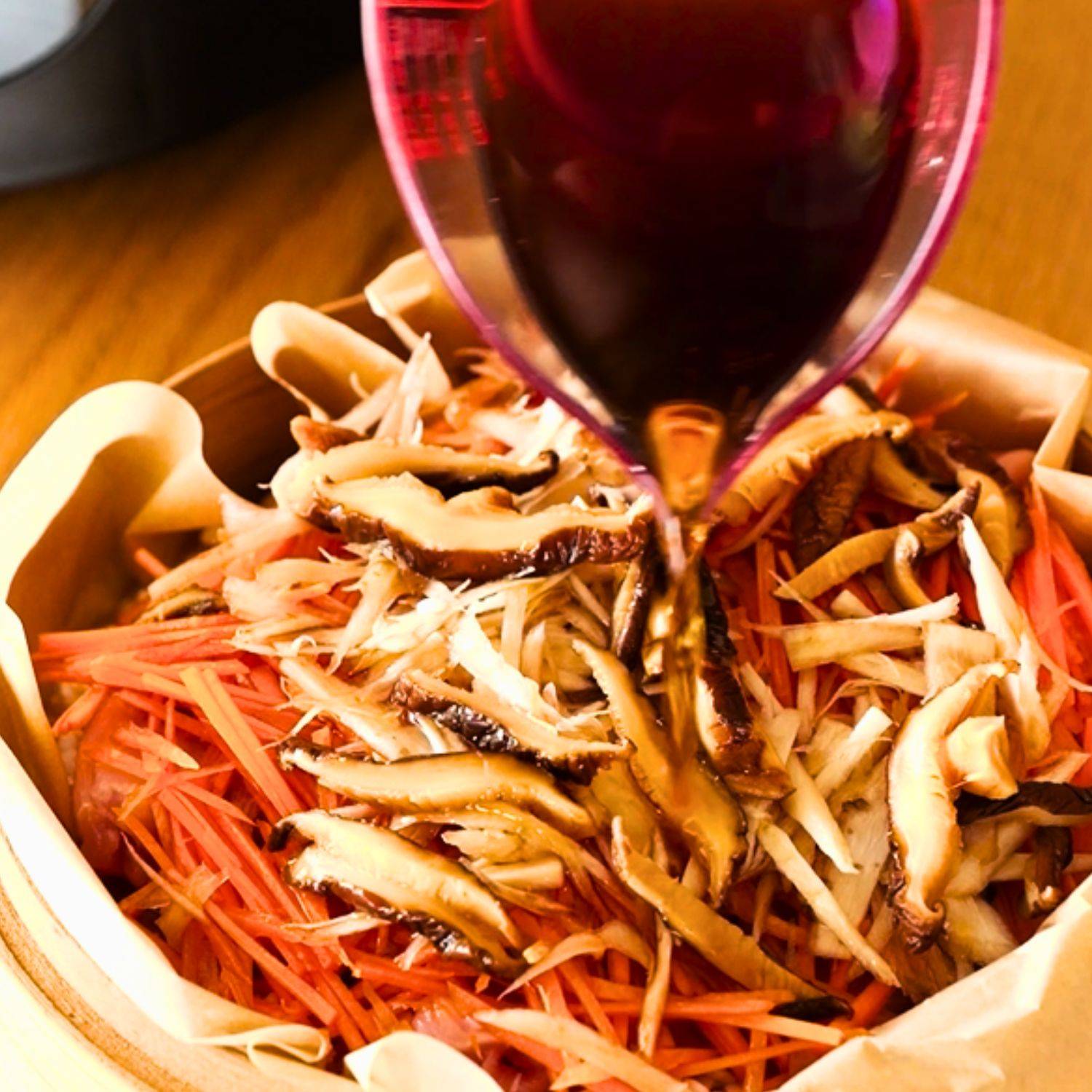 干し椎茸の戻し汁と水を合わせたものにA)を加えて混ぜ合わせる。