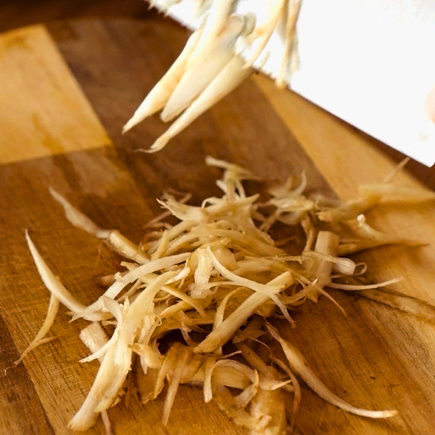 人参は千切り、ごぼうはささがき、干し椎茸は軸を落として細切りにする。