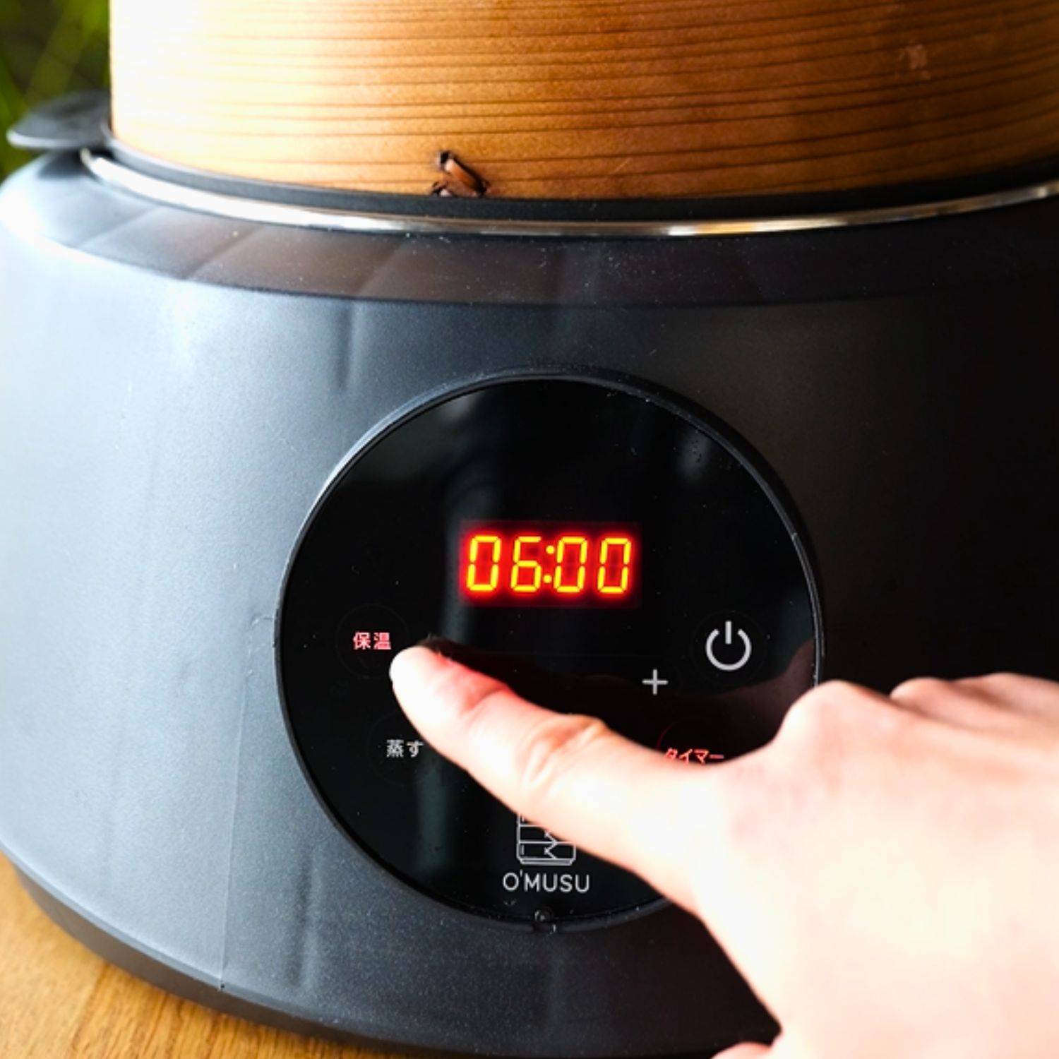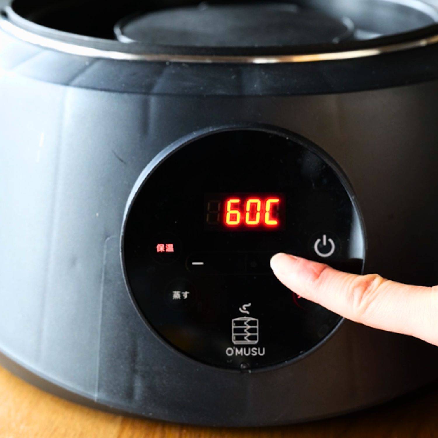 せいろをO’MUSUにのせ、保温60℃に設定し、タイマーを6時間+2時間(合計8時間)にセットし発酵させる。
