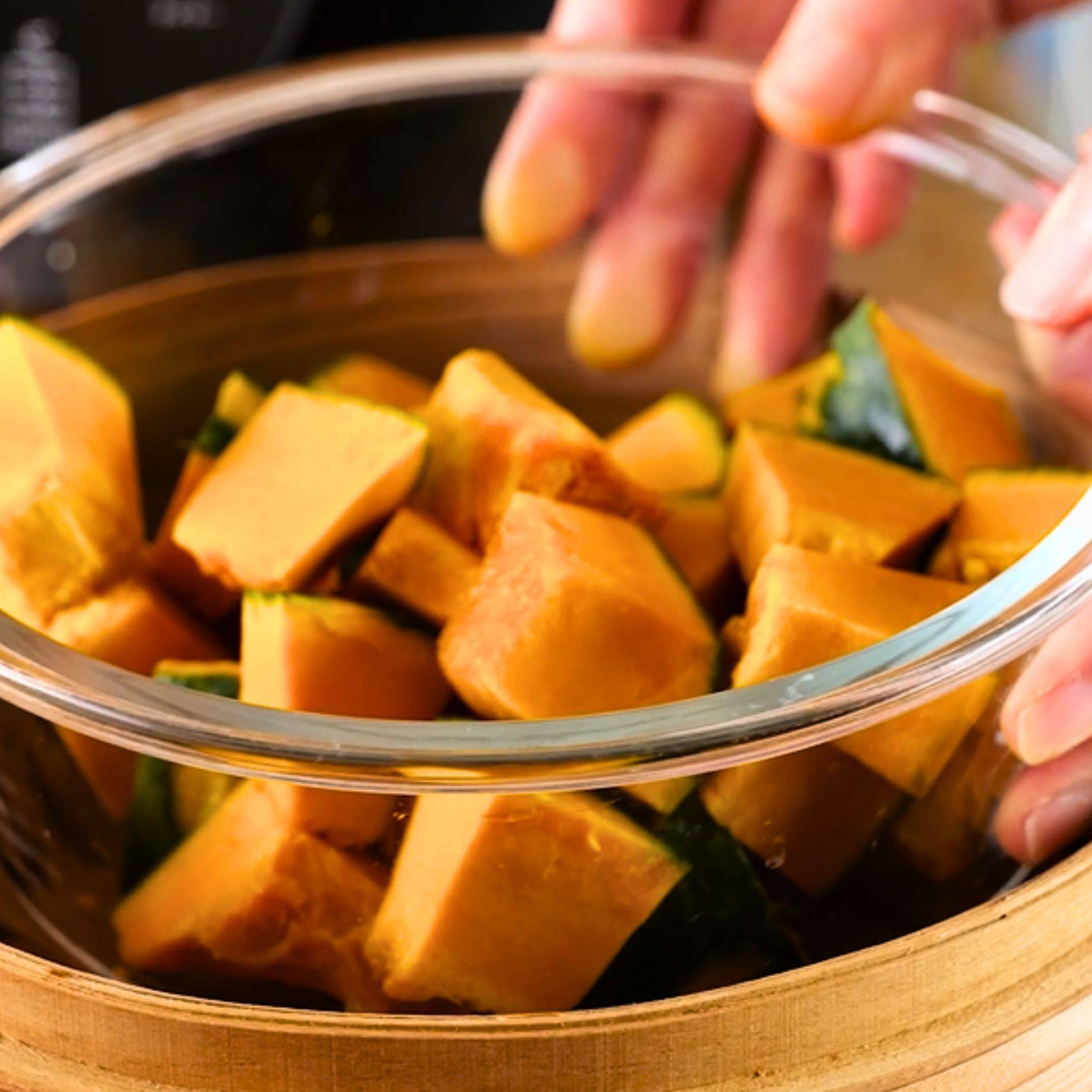 かぼちゃは皮をところどころむき、一口大に切ってガラス容器に入れる。