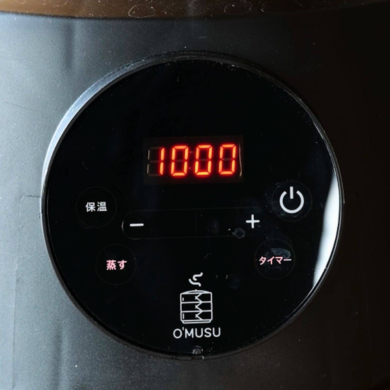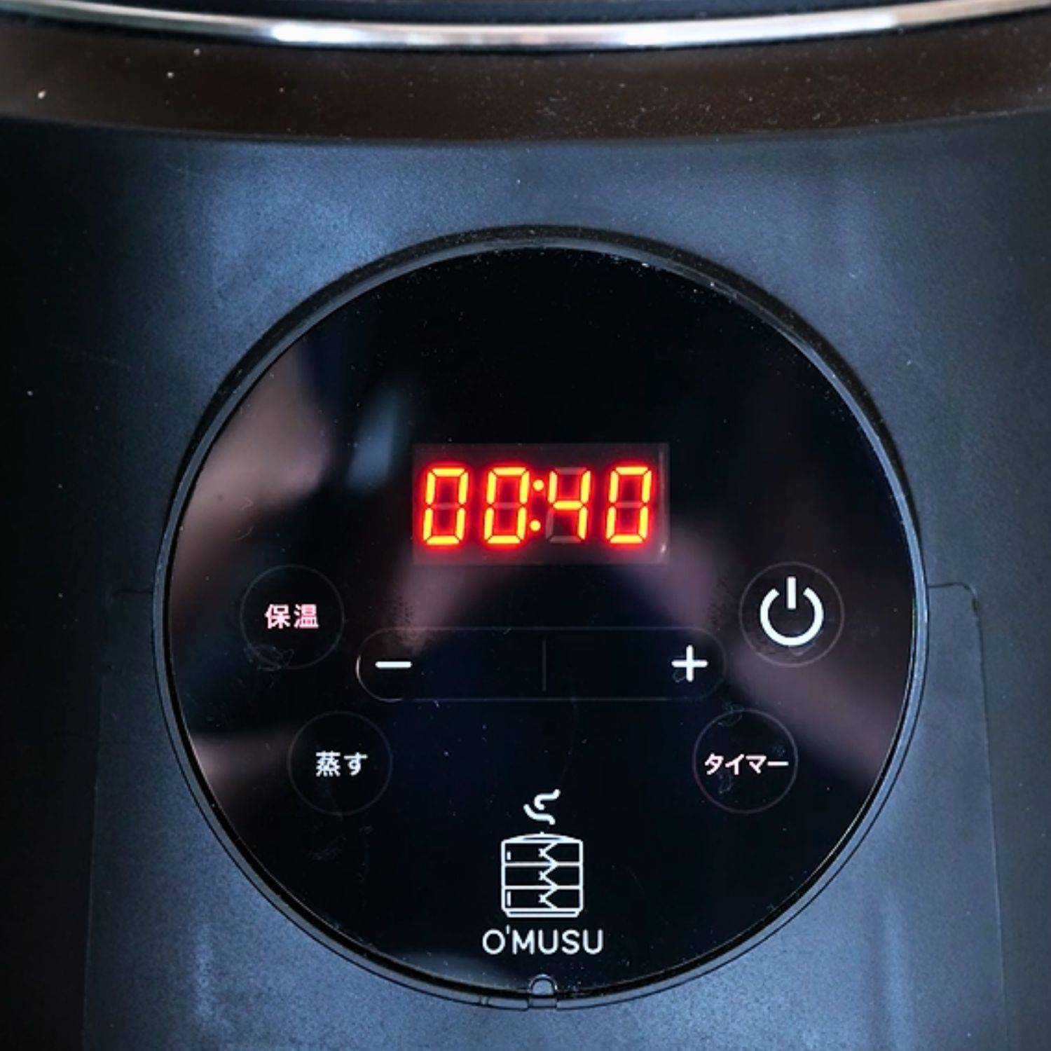 - O’MUSUに水切り筒をセットし、1000Wで予熱して蒸気を十分に上げる。