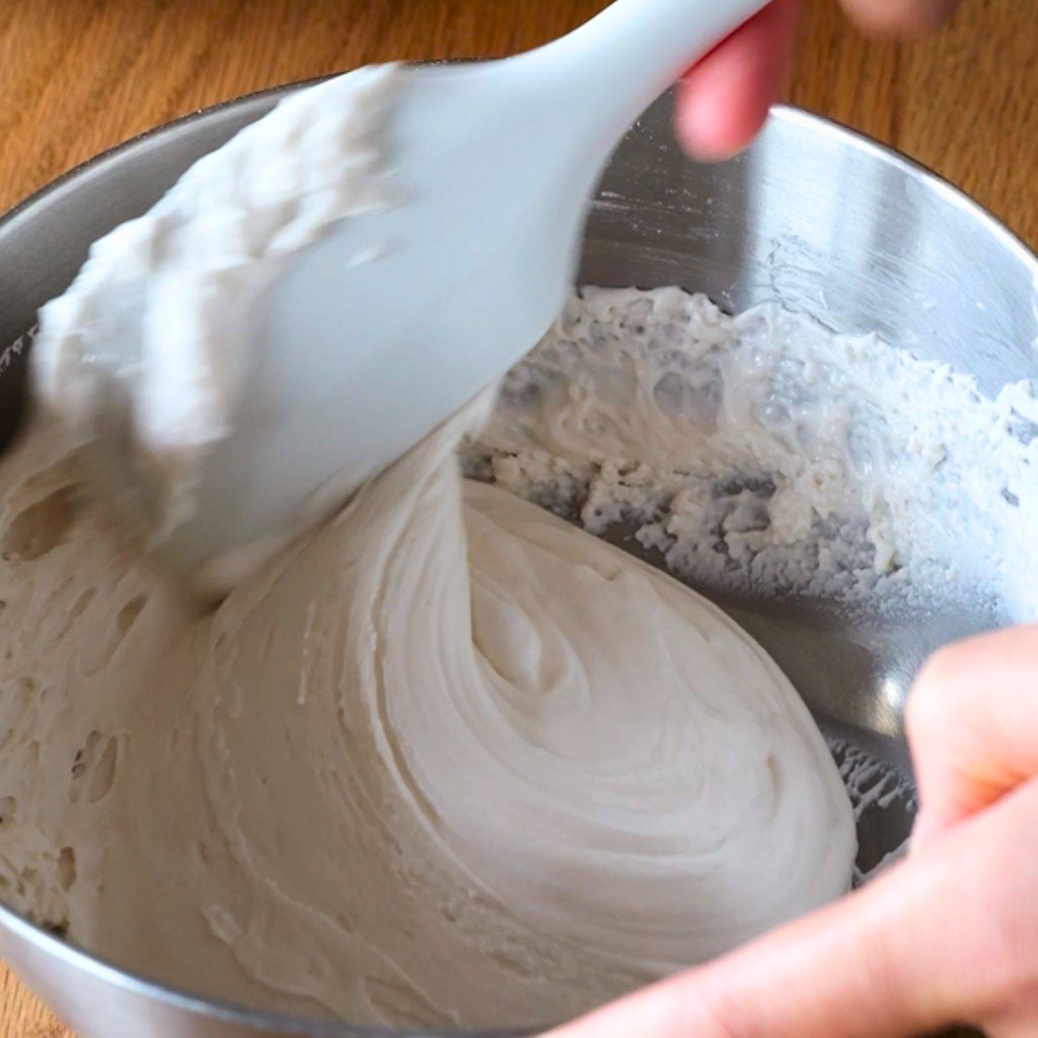 35℃に温めたバターと水を合わせて加え、艶が出てなめらかになるまで約3分混ぜ、せいろにのせる。