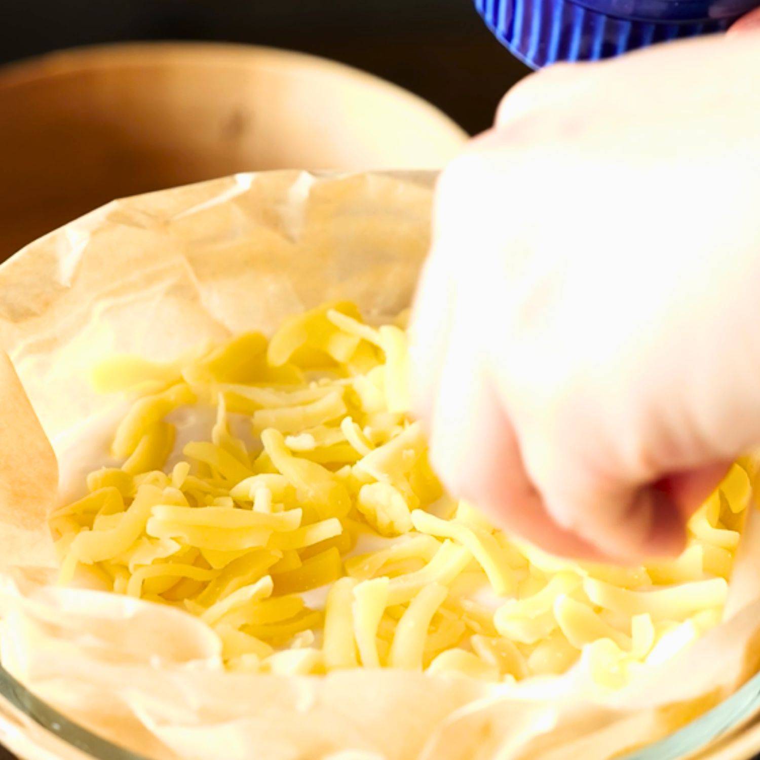 蒸しシート(クッキングシート)を敷いたガラス容器に④を流し入れ、保温60℃でタイマーを30分にセットして二次発酵する。