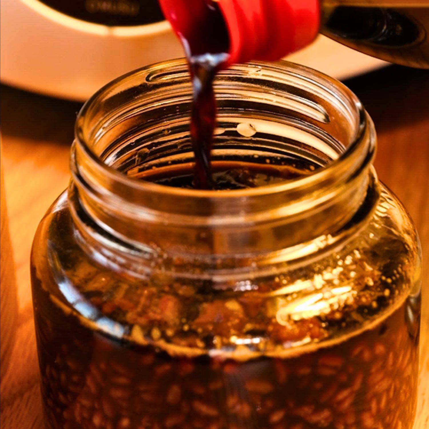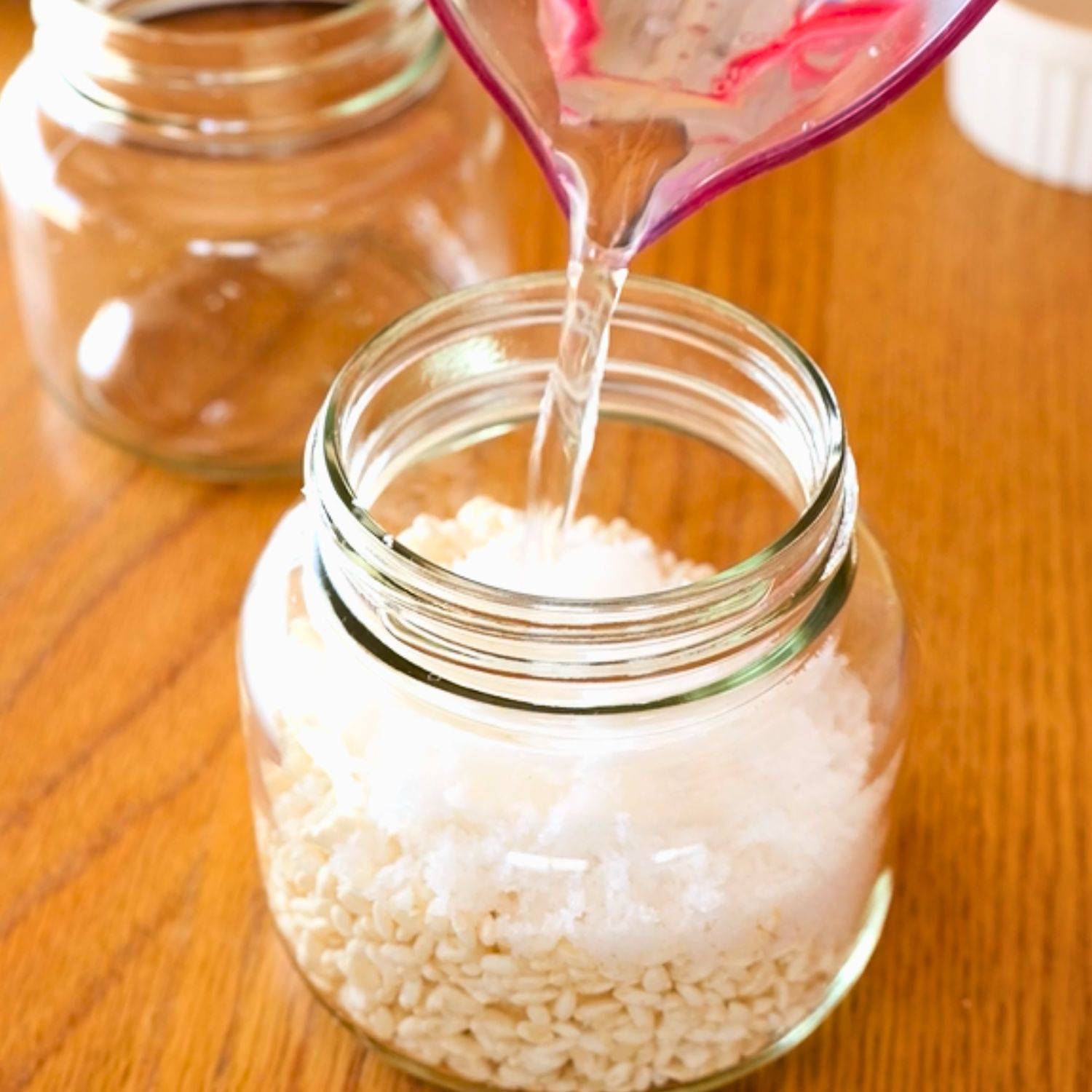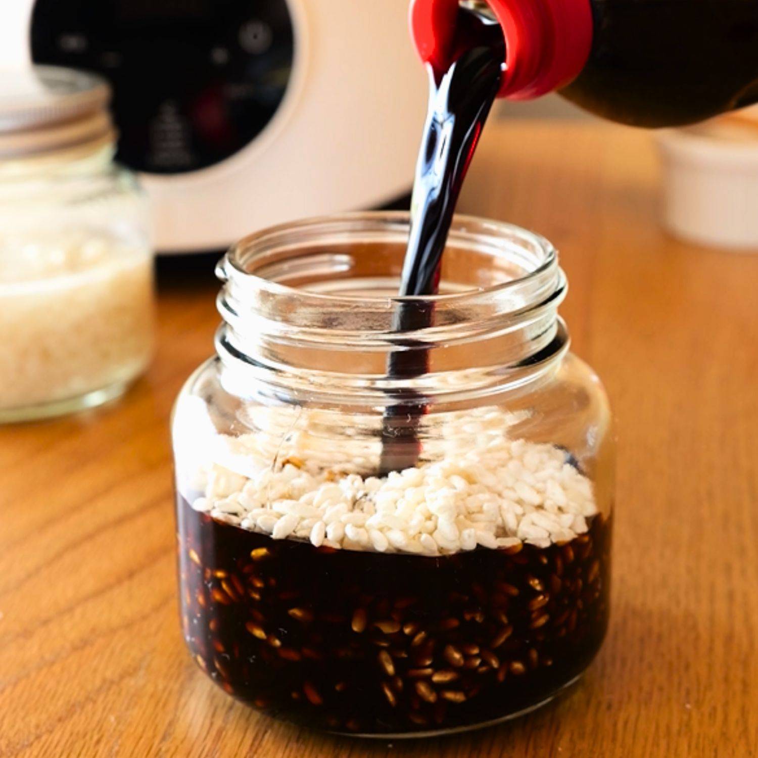 清潔な瓶に生米こうじを入れ、醤油を注ぎ、清潔なスプーンでよく混ぜ、フタをする。