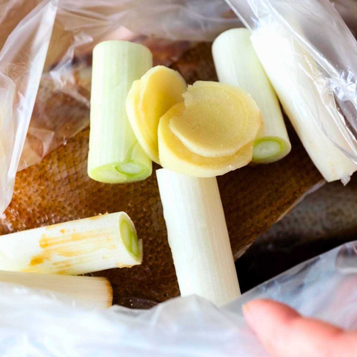 耐熱袋に下処理した魚・A・食べやすい長さに切った長ねぎ・薄切りにした生姜を入れ、軽くなじませる。