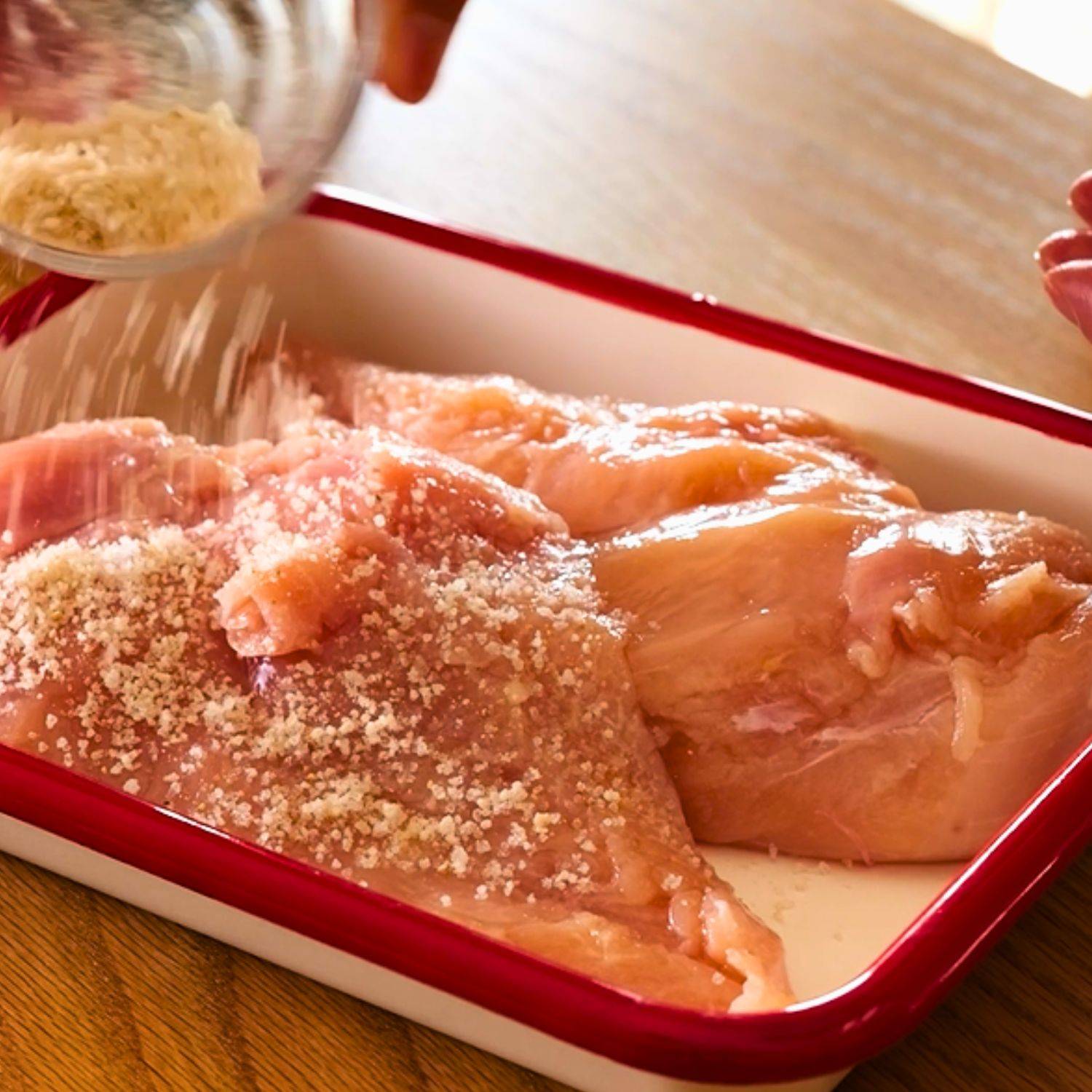 鶏むね肉に塩・砂糖・こしょうをまぶし、冷蔵庫で30分置いて味を馴染ませる。