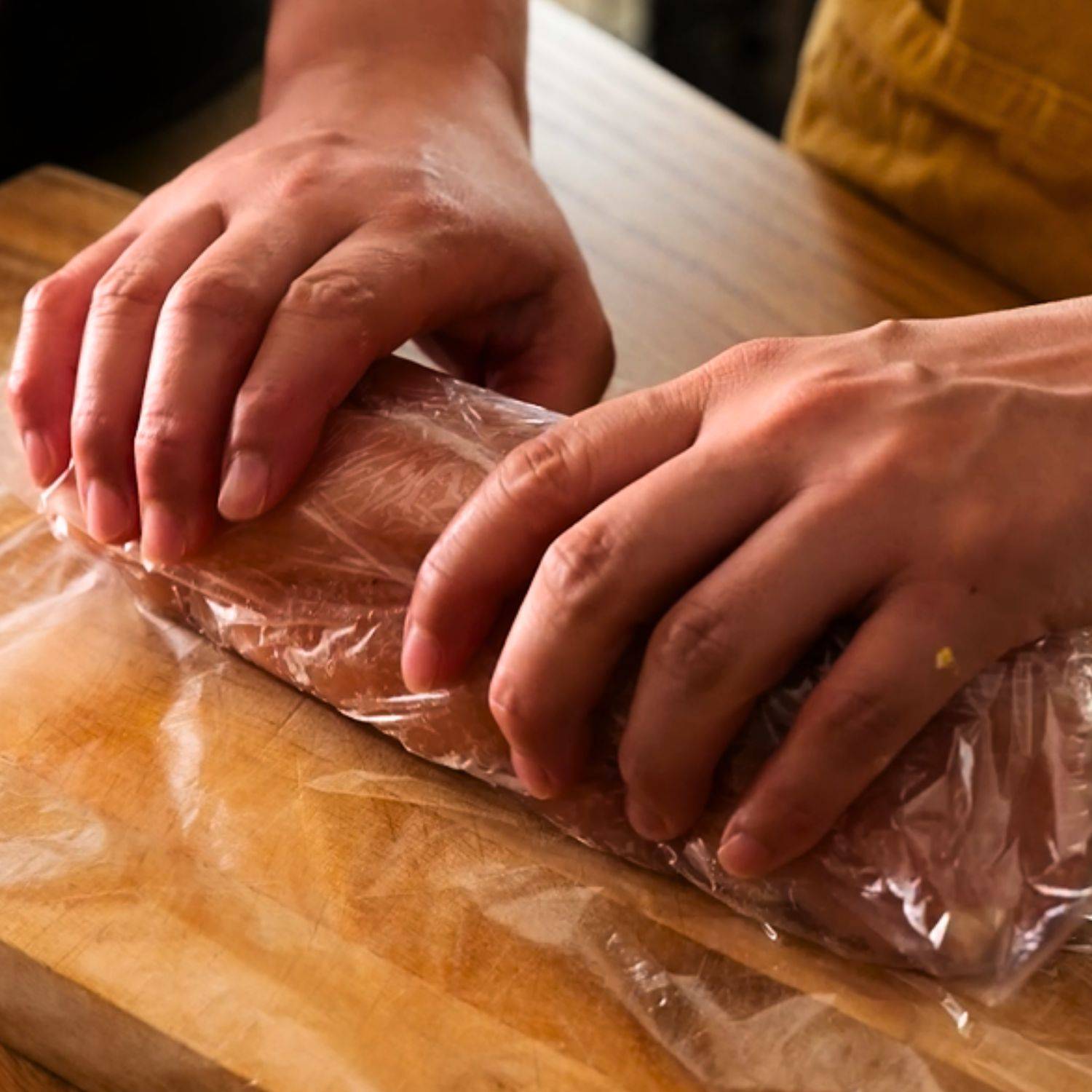 ラップの上に①を互い違いに並べ、端からくるくる巻いて筒状に整える。さらにラップでしっかり包み、ポリ袋に入れる。