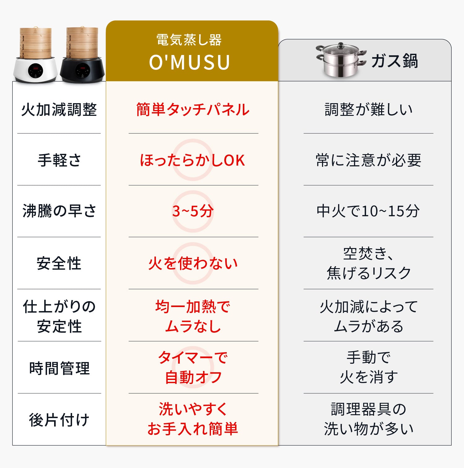 O'MUSUのメリットは「火を使わない圧倒的な手軽さ」にあります。